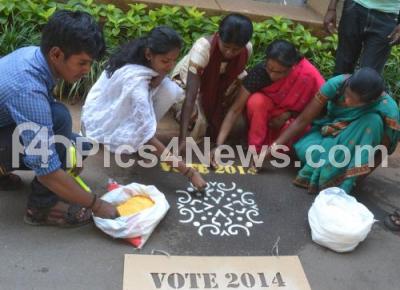 Photo Caption : Artists portray Rangoli Art, during the Awareness Campaign for People to Vote in Loksabha Elctions, at BBMP, in Bangalore on Friday 4th April 2014