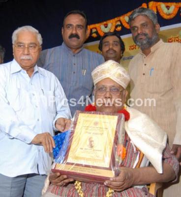 Prof HS Shivprakash being felicitated by Jnanpith Awardee Chandrashekhar Kambar, T Thimmesh and others, during the Felicitation Ceremony, at Kannada Sahitya Parishath, in Bangalore on Friday 4th April 2014