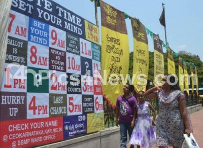 Photo Caption : Commuters walk past the Voting awareness Banners, during the Awareness campaign for upcoming Loksabha elections, at BBMP, in Bangalore on Monday 7th April 2014