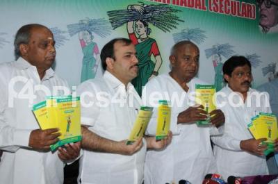 Photo Caption : HD Devegowda, JDs National President with Zameer Ahmed Khan, MLA and others seen releasing JDs Manifesto, at JDs Office, in Bangalore on Friday 11th April 2014