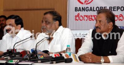 Photo Caption : Ambareesh, Housing Minister addressing with KJ George, Home Minister and others, during the press meet, at Hotel Lalit Ashok, in Bangalore on Friday 11th April 2014