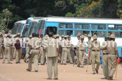 Photo Caption : Police depart for their Election Booths, deployed for the Karnataka Loksabha Elections, at City Armed Reserve (CAR) grounds, in Bangalore on Tuesday 15th April 2014