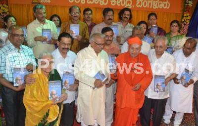 Photo Caption : Dr Shivamuarthy Shivacharya Mahaswamy with Dr HS Venkateshmurthy, Prof GS Siddalingaiah, Dr Manu Baligar and others seen releasing Kaavyantaraala Books, during the Kavyapoornima 2014 programme, at Taralabalu Kendra in Bangalore on Saturday 19th April 2014