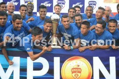 Photo Caption : Ecstatic Bengaluru FC Players celebrate with their I League Champions Trophy, at Bangalore Football Stadium, in Bangalore on Tuesday 29th April 2014