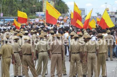 Photo Caption : Police deputed for the Protestors, during their protest against Toll Gate Fare Hike, at Airport Toll Gate, in Bangalore on Tuesday 6th May 2014
