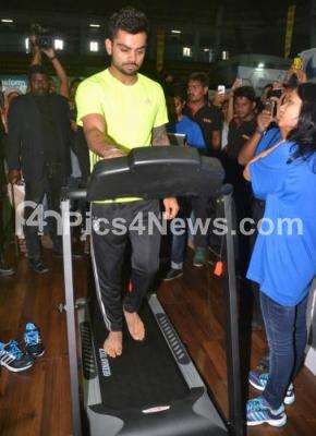 Photo Caption : Indian Cricketer Virat Kohli walks in the treadmill, during the TCS World 10K Active Expo, at Kormangala Indoor Stadium, in Bangalore on Saturday 10th May 2014