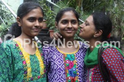 Photo Caption : Twin Sisters Abhighna secured 621 and Anughna secured 620 in their SSLC Examinations 2014, from VVS Sardar Vallabhai Patel School, celebrating with their mother, in Bangalore on Monday 12th May 2014