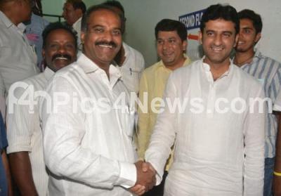 Photo Caption : PC Mohan, Bangalore Central BJP Candidate greeting Rizwan Arshad, Bangalore Central Congress Candidate at the lok sabha elections 2014 counting centre at RC college, in Bangalore on Friday 16th May 2014