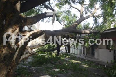 Photo Caption : Trees uprooted due to heavy rain in city, causing damage to properties, at Banashankari 1st Stage, in Bangalore on Thursday 22nd of May 2014