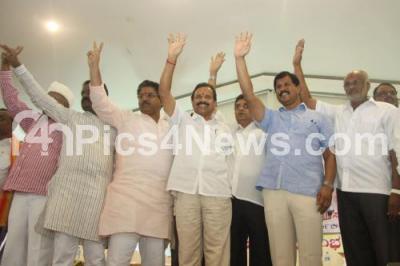 Photo Caption : DV Sadananda Gowda, Union Minister for Railways with R Ashok, Muniraju, Subbanarasimha and others flash victory sign to the BJP Bangalore North Constituency Party Workers, during the Felicitation Ceremony, at Sheesh Mahal, Palace Grounds, in Bangalore on Saturday 7th June 2014