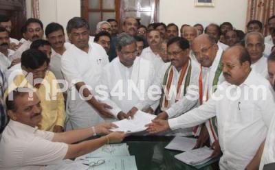 Photo Caption : BK Hariprasad, nominated for Rajya Sabha and Dr G Parameshwar, HM Revanna and Boseraj, nominated for legislative council, filing their nominations in the presence of CM Siddaramaih and other congress leaders at Vidhan Soudha, in Bangalore on Monday 9th June 2014