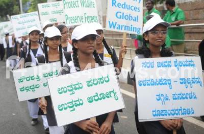 Event Description : School Children partake in environment awareness rally during Environment award presentation program, organised by Department of Forest, Ecology, Environment and Karnataka State Pollution control Board at Jnana Jyothi Auditorium, in Bangalore on Monday 9th June 2014