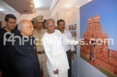 Photo Caption : Governor HR Bhardwaj gazing at the Miniature designs and paintings on Brihadishwara Temple of Thanjavur, at Venkatappa Art Gallery, in Bangalore on Friday 13th June 2014