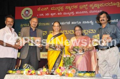 Photo Caption : GV Renuka with Dr S Vidyashankar, RG Halli Nagaraj, Hemalatha Mahishi and others seen releasing Sele and Arivina Mahaguru Allama Prabhu Books, organized by KS Muddappa Memorial Trust, at Nayana, in Bangalore on Thursday 19th June 2014