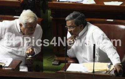 Photo Caption : K Siddaramaiah, Chief Minister discussing with RV Deshpande, Tourism Minister, during the Assembly Session at Vidhana Soudha, in Bangalore on Wednesday 25th June 2014