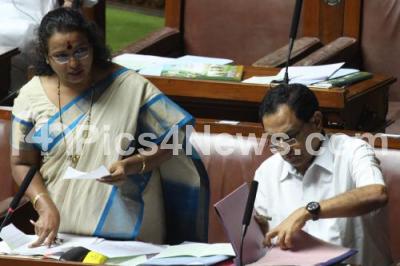 Photo Caption : Umashree, Kannada and Culture Minister addressing with Kimmane Ratnakar, Primary and Secondary Education Minister, during the Assembly Session at Vidhana Soudha, in Bangalore on Wednesday 25th June 2014