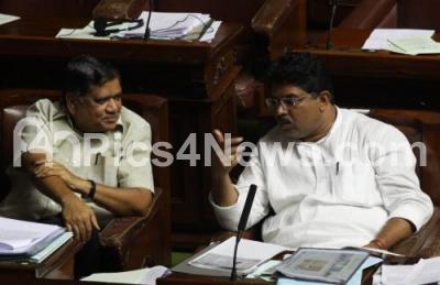 Photo Caption : Opposition Leaders Jagadish Shettar and R Ashok seen discussing, during the Assembly Session, at Vidhana Soudha, in Bangalore on Wednesday 25th June 2014