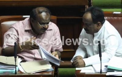 Photo Caption : HD Kumarswamy seen discussing with MLA, during the Assembly Session, at Vidhana Soudha, in Bangalore on Wednesday 25th June 2014