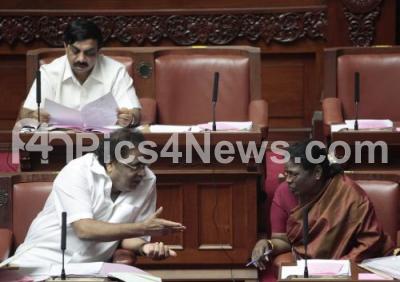 Photo Caption : Ambareesh, Housing Minister seen interacting with Motamma, MLC, during the Council Session, also seen Govindraju, MLC, at Vidhana Soudha, in Bangalore on Friday 27th June 2014
