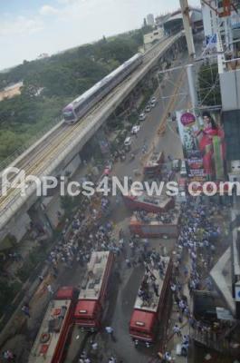 Photo Caption : Metro Passes by as Fire Extinguishers and Firemen where dozing off the Fire, which was caught at Navarathan Jewellers, at MG Road, in Bangalore on Thursday 3rd July 2014