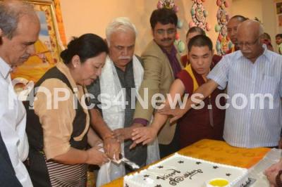 Photo Caption : RV Deshpande, Tourism Minister with Dolma Gyari, Kalon for Home Department, Central Tibetan Administration seen cutting cake celebrating Birthday of Spiritual Leader Dalai Lama, during the Tibet Festival 2014, at Karnataka Chitrakala Parishat, in Bangalore on Sunday 6th July 2014