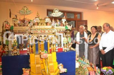 Photo Caption : RV Deshpande, Tourism Minister with Dolma Gyari, Kalon for Home Department, Central Tibetan Administration and others gaze at Tibetan Art, during the Tibet Festival 2014, celebrating Birthday of Spiritual Leader Dalai Lama, at Karnataka Chitrakala Parishat, in Bangalore on Sunday 6th July 2014