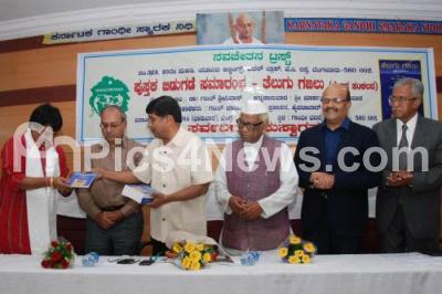 Dr Ho Srinivasaiah with Dr Gajal Srinivas, Markandapuram Srinivas, KC Ramamurthy and Dr HSM Prakash seen releasing the Telugu Gajalu Book, organized by Navachetana Trust, at Gandhi Bhavan, in Bangalore on Sunday 6th July 2014