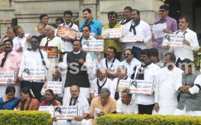 Event Description : BJP MLAs and MLCs wear a black cloth protesting against State Government for not ensuring security to curb atrocities on women, in front of Kengal Hanumathaiah Statue, Vidhana Soudha, in Bangalore on Friday 18th July 2014