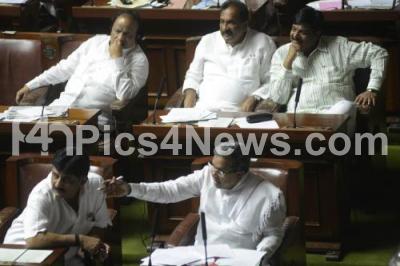 Photo Caption : Chief Minister K Siddaramaiah seen interacting with DK Shivakumar, Power Minister, also seen HC Mahadevappa, PWD Minister, KJ George, Home Minster and R Roshan baig, Minister for Information and others, during the Assembly Session, at Vidhana Soudha, in Bangalore on Friday 25th July 2014