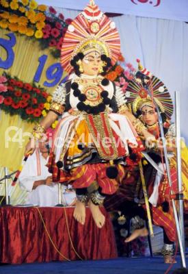 Photo Caption : Yakshagana artists performing during Suvarna Mahotsava (Golden Jubilee) of Dakshina Kannada Koota Brahamanara Mitra Mandali, at Guru Narasimha Kalyana Matapa, Basavanagudi, in Bangalore on Sunday 27th of July 2014