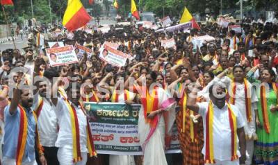 Members of Karnataka Rakshana Vedike partake in a protest rally against MES MLAs and Leaders for their attack on Kannadigas in Belagavi, the rally was held from Town Hall to Freedom Park, in Bangalore on Monday 28th July 2014