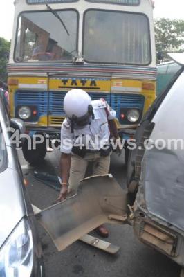 Photo Caption : Serial Accidents after a Lorrys break failure, sustaining Minor injuries to the driver, leading huge traffic jam, at Double Road, in Bangalore on Wednesday 30th July 2014