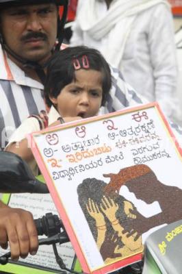 Photo Caption : Commuters ride with placards against increasing incidents of Rape in the wake of Bangalore Bandh, at SBM Circle, in Bangalore on Thursday 31st July 2014