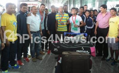 Event Description : Indian Men Hockey team which bagged the silver in the just culminated 20th commonwealth games arrived at the Kempegowda International Airport, in Bangalore on Tuesday 5th August 2014