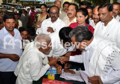 Photo Caption : Chief Minister K Siddaramaiah seen listening to public grievances, outside Zilla Panchayat Office, in Mysore on Tuesday 5th August 2014
