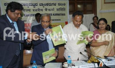 Photo Caption : Kaushik Mukherjee, Chief Secretary with M Anjaneya Prasad, ED, Syndicate Bank, Latha Krishna Rao, ACS and DC, GoK and others seen releasing Souvenir, during the State Level Bankers Committee Meeting, at Vidhana Soudha, in Bangalore on Wednesday 6th August 2014