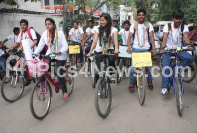 Photo Caption : Enthusiastic Boys and Girls from various colleges in Bangalore City have ventured into cycling to create awareness and hazards on use of Plastics, which is rampant, by peddling all the way from Bangalore to Chitradurga as part of national service scheme and independence day celebrations, the cyclothon was flagged off at Gandhi Bhavan, in Bangalore on Monday 11th August 2014