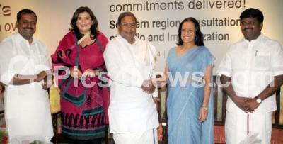 Photo Caption : Chief Minister K Siddaramaiah with Health Minister UT Khader, Dr Nata Menabde, WHO Representative to India, Dr Poonam Khetrapal Singh, WHO Deputy Regional Director for South East Asia and Tamil Nadu Minister Dr C Vijaya Baskar seen during the Southern Region Consultation on Polio and Immunization, organized by World Health organization, at Hotel Lalit Ashok, in Bangalore on Tuesday 19th August 2014