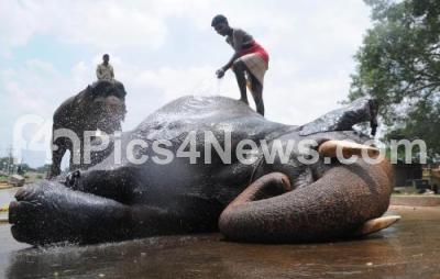 Photo Caption : Dasara Jumbos being showered, ahead for Dasara Mahotsav 2014, at Mysore Palace premises, in Mysore on Thursday 21st August 2014
