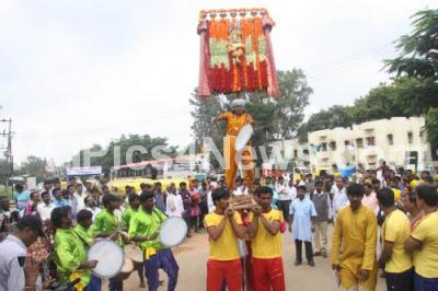 Photo Caption : Cultural Artists perform, during the procession, celebrating World Folklore Day Celebrations, at Kalagrama, Bangalore University, in Bangalore on Friday 22nd August 2014