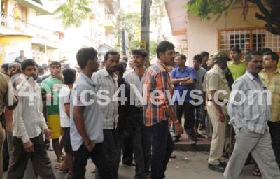 Photo Caption : People gathered outside 24 year old cab driver Pradeep Eeerannaiah Kumar who committed suicide yesterday, following the chaos as angry mob burnt police motor bike and tried to attack police officials last night, in Bangalore on Sunday 24th August 2014