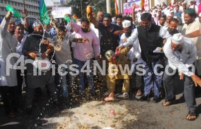 Muslim Brothers protest against Israel Terrorism and genocide against Palestinians in occupied Gaza, cold blooded massacre of innocent women and children is being carried out by the Zionists Israel government and its blatant violation of International laws, Muslim brothers demonstrate throwing softdrinks on grounds to boycott all Israel products, the protest was held at Town hall, in Bangalore on Sunday 24th August 2014