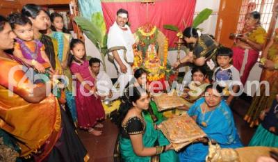 Photo Caption : People performing pooja, celebrating Gowri ganesha Festival, in Mysore on Thursday 28th August 2014