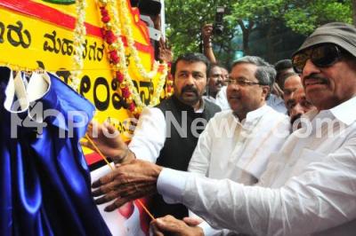 Photo Caption : K Siddaramaiah, Chief Minister renamed Indiranagar 100ft Road to Dr SK Kareem Khan Road, also seen Vatal Nagaraj, President, Kannada Okkuta with MLA NA Haris and others, in Bangalore on Sunday 31st August 2014