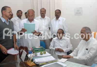 Photo Caption : NY Gopalakrishna, Congress MLA taking oath as MLA, who won the Bye Election from Bellary Rural Assembly, in presence of Assembly Speaker Kagodu Thimmappa, in his chambers, at Vidhana Soudha, in Bangalore on Wednesday 3rd September 2014