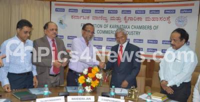 Photo Caption : S Sampathraman, President, FKCCI greeting Mahendra Jain, IAS, Principal Secretary, Co operation Department, GoK, during the Interactive Meeting, also seen Bharath Kumar R Shah, Chairman, Internal Trade Committee, Tallam R Dwarakanath, Senior Vice President, FKCCI, Dr Muddu Mohan, IAS, Director, Agriculture Marketing Department and others, at FKCCI, in Bangalore on Friday 5th September 2014