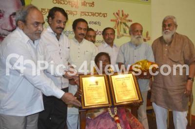 Photo Caption : Gowramma, President, Charaka Samsthe being felicitated from Ramakrishna Hegde Award by BL Shankar, Prasanna, BR Patil, DK Chowta and others, at Karnataka Chitrakala Parishat, in Bangalore on Saturday 6th September 2014