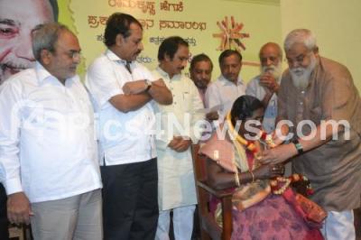 Photo Caption : Gowramma, President, Charaka Samsthe being felicitated from Ramakrishna Hegde Award by BL Shankar, Prasanna, BR Patil, DK Chowta and others, at Karnataka Chitrakala Parishat, in Bangalore on Saturday 6th September 2014