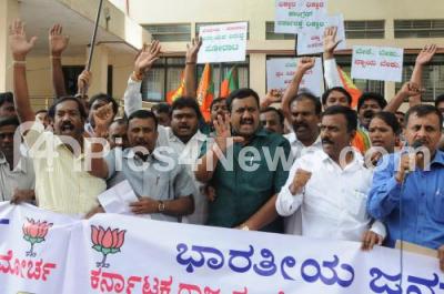 Photo Caption : Members of BJP Slum Morcha Protest, demanding to give Property Position Certificate to the Slum, at DC Office, in Bangalore on Monday 8th September 2014