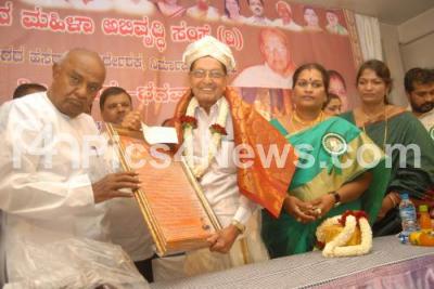 Photo Caption : HD Devegowda, Former Prime Minister of India felicitated Dorai Bhagwan, Film Director and others, during the Distribution programme of Sewing Machines to the needy people, also seen Lasatu Kumar, President, Santwana Women Welfare Society, at Sajjanrao Kalyana Mantapa. in Bangalore on Tuesday 9th September 2014